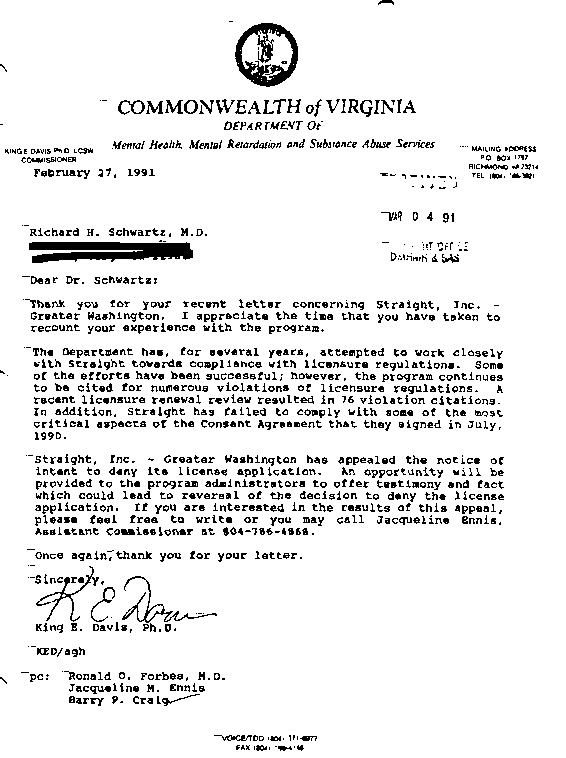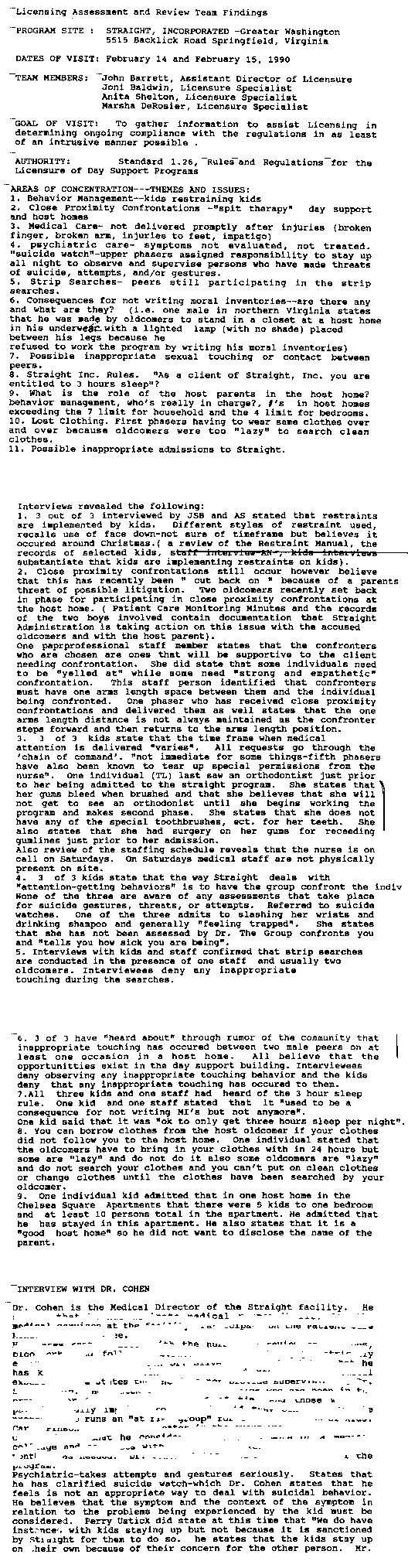 Virginia Dept. Mental Health letter of Sept 6 , 1989 from Joni Baldwin cited Straight for violation of human rights by refusing contact with one's family. Dept Mental Health site inspections Jan 24/ 27 & Feb 2/6 1989 found that eight clients had been deprived of toilet facilities by upper phasors. Straight was cited for using clients to supervise and restrain other clients, for using inappropriate punishment for not writing MIs such as deprivation of nutritionally balanced meals, for spot light therapy-sleep deprivation, for not allowing clients access to their parents, for strip searching clients in the presence of peers. Dept Mental Health, letter on 6-13, 1989 to Straight noted that clients restrain other clients by lip pushing, thumb bending, and forcible arm bending. Straight was advised that clients acting as volunteers do not have qualifications appropriate to render physical restraints. Judge Donald Crounse, a Fairfax Virginia judge, had to file a Writ of Habeas Corpus in order to visit his own son in Straight (1982 or 1983).