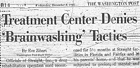 Colin Caroll alleges he was fed apple and water for his main meal; he was alternately allowed sleep 15 minutes, then awakened 15 minutes until he got his required 3 hours; sometimes punishment was "spot light" therapy where you had to stare at a bright light.(6) Brian DeCunzo alleges he was forced to admit to drug usage he had not done; his mother claims that they made kids admit to incest that never occurred.(7) John Doe Va-1 reports being struck in the nose on 1/28/89 by Chris Roberts and taken to the emergency room at Fairfax Hospital.(8) A 13 year-old male client alleges he was sexually abused by a 19 year-old oldcomer who had previously abused two other newcomers in his care, yet was allowed to continue in the program. Fairfax, Va. attorney Sandra Havrilak, represented this boy and several other Straight clients.