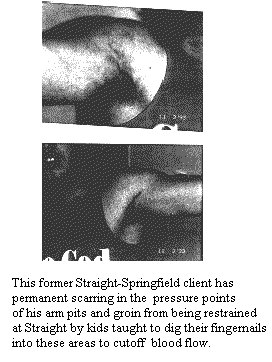 A 19 year-old told a reporter that he was restrained and his finger was pulled back until he admitted he used drugs. He was put on bread and water and once he was punched so hard in his face that some blood vessels broke in his eye requiring him to see a doctor.(5) C. H. (then 21) alleges while led around by the seat of his pants he was repeatedly slammed into a wall. Fighting back he was restrained by several oldcomers. During one incident his left thumb was forcefully bent backward until it almost physically touched his wrist requiring medical attention once he left Straight. He was not allowed to use the bathroom while at the facility. He attempted to withdraw himself from host home and was restrained, tackled, slammed to the ground and beaten by 6 or 7 oldcomers. Police were called to stop the beating and police acknowledged he was being held against his will. As a result of Mr. H.'s allegations and that of client #89002, state licensing officials investigated and got written testimony from 4 people who witnessed the restraint at the M-K home. The department cited Straight for forcing clients to "motivate" which they ruled as degrading to human dignity, for not assuring that grievances would be heard by the necessary staff, for not allowing clients contact with family or outside world, for "spotlight therapy", for refusing clients bathroom privileges causing some to mess in their pants, and for restraining clients for "talking behind backs".